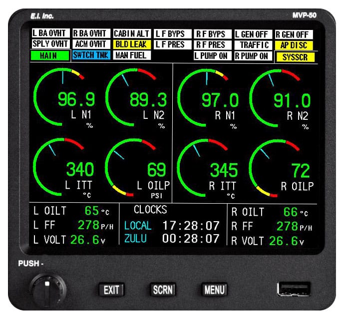 At the top of the MVP-50 display is a Crew Alert System (CAS) incorporating up to 21 annunciators. At the bottom, you can display 6 to 8 functions in a digital-only format. In the center of the display, arc and strip gauges are provided in a number of formats.
